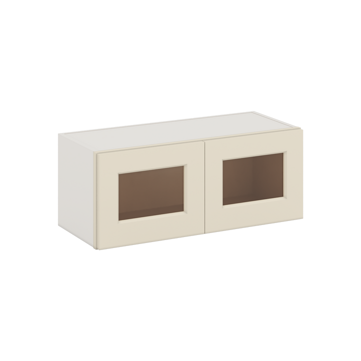 30" Wide Bridge Vanilla Cream Shaker 1-1/4" Overlay Wall Glass Cabinet - Double Door 12", 15", 18", 21" & 24" Tall
