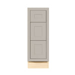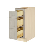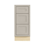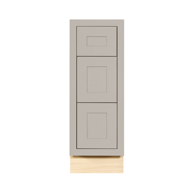 The front of the cabinet has three drawers with the top drawer being the same depth as a top drawer on all base cabinets and the lower two drawers are equal to each other.