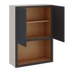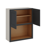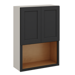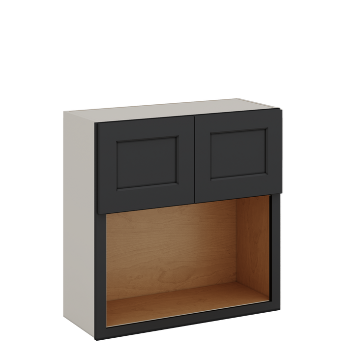 This cabinet provides a practical shelf section for placing microwave appliances, combining modern design with efficient utility.