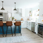The face frame, door, drawer front, and door panel are custom UV Lacquer painted and the cabinet box and shelving are coated with a clear UV protectant finish. Each cabinet door and drawer front is made of five pieces with tongue and groove joinery.