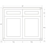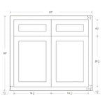 The front of the cabinet features two static (fixed) drawer fronts and two doors with soft-close hinges for smooth operation. The cabinet face is made of solid birch wood and is 1-3/4 inches thick, including a 1-inch face frame and a 3/4-inch interior stop frame.