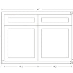 The front of the cabinet has a two static top drawers and the lower section has a pair doors. The door hardware will stay open at 105 degrees and softly close with a light push.