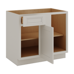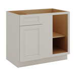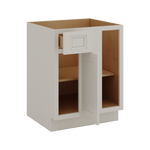 Our 27LGDS Laguna Gray Double Shaker 1-1/4" blind corner cabinets are the perfect solution to corner cabinet storage. These cabinets are ready to assemble (RTA) and can be used as either a blind corner left or right by switching the location of the drawer and door. Measuring 36" wide (up to 42" wide when pulled from corner) or 42"s wide with the maximum 45"s and 24" deep by 34-1/2" tall, these cabinets are spacious and versatile, and can be used for left or right side door opening.