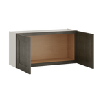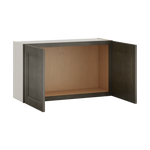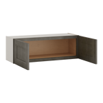 36" Wide Wall cabinets, select the desired height by 12" deep. Huntington Cinder Double Shaker wall kitchen cabinet RTA (Ready to Assemble). These cabinets are typically used over a 36" wide stove and will have a hood or microwave hood attached underneath with a vent hole being cut through the cabinet when exterior exhaust is necessary.