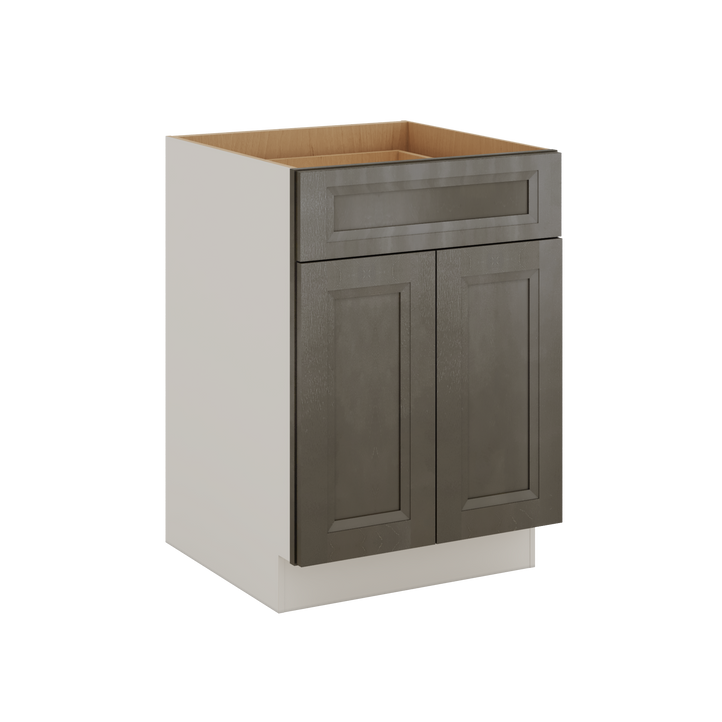 Our Huntington Cinder Double Shaker 1-14" base kitchen cabinets, the perfect addition to any kitchen remodel or new construction project. These cabinets are ready to assemble (RTA) and feature a single top drawer and lower section with two doors, providing ample storage space for all of your kitchen essentials.