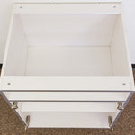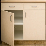 Plywood construction cabinets (3/4") with with white stain resistant melamine drawer boxes or metal drawer boxes and 3/4" shelves (where applicable). All exposed visible side areas are finished white melamine with white melamine finished interior.