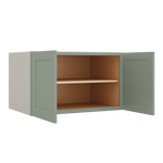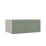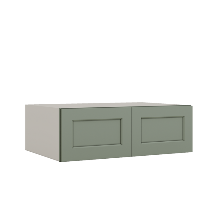 Our 14SG Sage Green Shaker 1-1/4" Overlay 36" wide by 24" deep wall cabinet is ideal for use above refrigerators. Designed for flexibility and visual cohesion, it can be boxed in with matching side panels or placed alongside pantry cabinetry.