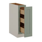 Base Spice Rack Pull Out cabinet is available in 9 and 12 inch widths by 24 inch deep by 34-1/2 inch tall. These ready-to-assemble cabinets feature a 1-1/4 inch overlay 14SG Sage Green Shaker design.