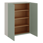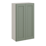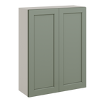 Spacious wall cabinet in 14SG Sage Green with shaker doors, adjustable shelving, and overlay design.