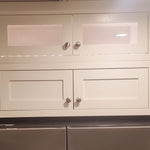 The face frame, door, drawer front, and door panel are custom UV Lacquer painted and the cabinet box and shelving are coated with a clear UV protectant finish. Each cabinet door and drawer front is made of five pieces with tongue and groove joinery.