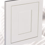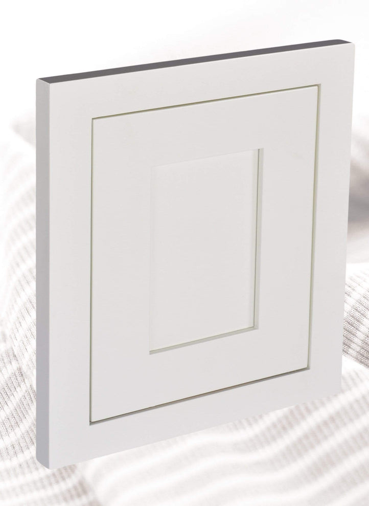 This is a sample door for our Snow White Inset Shaker cabinetry. It is inset into a sample cabinet face frame to show the "Inset" style of our cabinets.