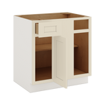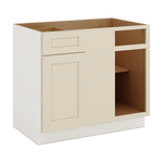 Our Manhattan Cream Shaker 1-1/4" Overlay blind corner cabinets are the perfect solution to corner cabinet storage. These cabinets are ready to assemble (RTA) and can be used as either a blind corner left or right by switching the location of the drawer and door. Measuring 36" wide (up to 42" wide when pulled from corner) or 42"s wide with the maximum 45"s and 24" deep by 34-1/2" tall, these cabinets are spacious and versatile, and can be used for left or right side door opening.