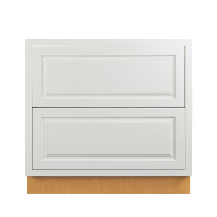 Drawer base cabinet 36" wide by 24" deep by 34-1/2" tall. Vintage White Raised Panel TWO (2) drawer base kitchen cabinet RTA.