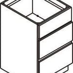 The front of the cabinet has three drawers with the top drawer being the same depth as a top drawer on all base cabinets and the lower two drawers are equal to each other.