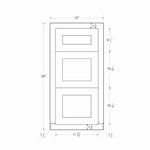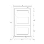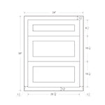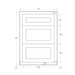 Each base cabinet is 24" deep by 34-1/2" tall. White Oak Shaker three drawer base kitchen cabinet RTA.