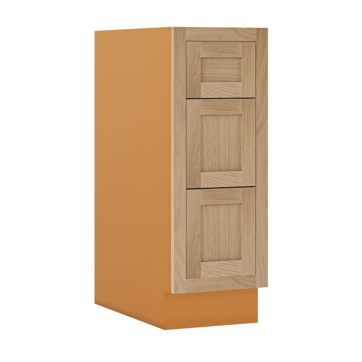 The front of the cabinet has three drawers with the top drawer being the same depth as a top drawer on all base cabinets and the lower two drawers are equal to each other.