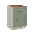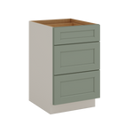 Our 14SG Sage Green Shaker 1-1/4" Overlay three drawer base cabinet is a sleek and practical addition to any kitchen remodel or new construction. Ready to assemble (RTA), it features three equal-height drawers, providing both style and functionality to your space.