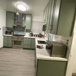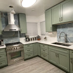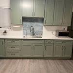 Each base cabinet is 24 inch deep by 34-1/2 inch tall. This inset Shaker cabinet comes ready-to-assemble with Oxford Blue finish.