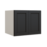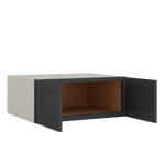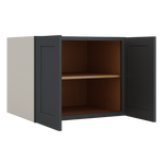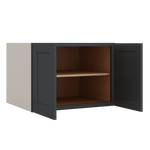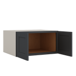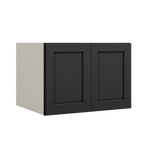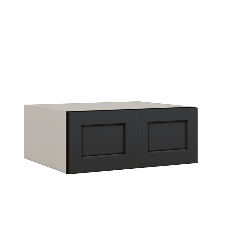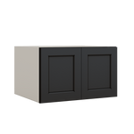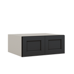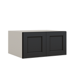This 30" wide by 24" deep bridge wall cabinet in 15HNS Hermosa Noir Black Shaker style is designed to fit above pantry or fridge spaces, offering a sleek and functional storage solution. Ideal for compact kitchens using a smaller fridge, this RTA (Ready to Assemble) cabinet features overlay doors for a modern look.