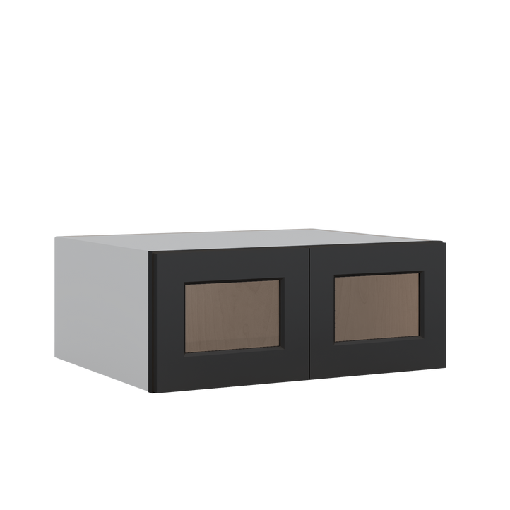 30" Wide x 24" Deep Wall cabinets, select the desired height by 12" deep. 15HNS Hermosa Noir Black Shaker 1-1/4" Overlay wall kitchen cabinet RTA (Ready to Assemble). These cabinets are typically used over a 30" wide Pantry or Fridge and will have a Fridge side panel on one side or both or next to a pantry cabinet. This cabinet is used where a smaller size fridge is used.