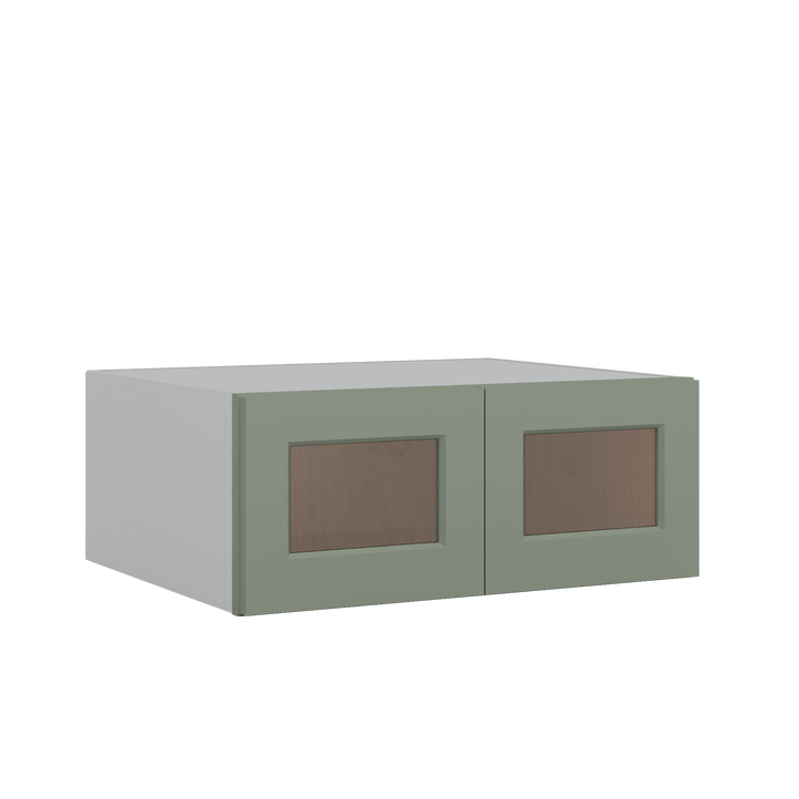 30" Wide x 24" Deep Wall cabinets, select the desired height by 12" deep. green Shaker 1-1/4" Overlay wall kitchen cabinet RTA (Ready to Assemble). These cabinets are typically used over a 30" wide Pantry or Fridge and will have a Fridge side panel on one side or both or next to a pantry cabinet. This cabinet is used where a smaller size fridge is used.
