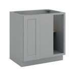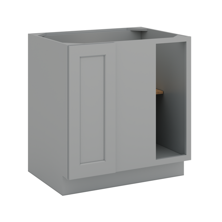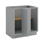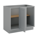 Our Gray Shaker 1-1/4" Overlay blind corner cabinets are the perfect solution to corner cabinet storage. These cabinets are ready to assemble (RTA) and can be used as either a blind corner left or right by switching the location of the drawer and door. Measuring 36" wide (up to 42" wide when pulled from corner) or 42"s wide with the maximum 45"s and 24" deep by 34-1/2" tall, these cabinets are spacious and versatile, and can be used for left or right side door opening.