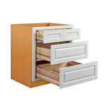 Each base cabinet is 24" deep by 34-1/2" tall. Vintage White Raised Panel three drawer base kitchen cabinet RTA. The front of the cabinet has four (4) drawers with the top...