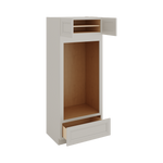 Wall Oven cabinet by 24"deep. 1-1/4" Overlay Manhattan Cream Shaker Wall Oven kitchen cabinet RTA (Ready to Assemble). The front of the cabinet has two (2) doors with soft close hinges above the ovens...